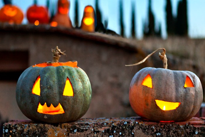 -Jack O’Lantern: Con este curioso nombre se conoce a las calabazas (pumpkins) cortadas en forma de cara y con una vela en su interior. El nombre proviene de una antigua leyenda protagonizada por Jack El Tacaño (Stingy Jack) que después de engañar al diablo en varias ocasiones fue condenado a vagar con un farol hecho con un vegetal. Aunque originariamente se empleaba un nabo (turnip) finalmente se imponen las calabazas por ser más vistosas y más fáciles de cortar. La venta masiva de calabazas ha dado lugar en EEUU a los Pumpkin Patches (Terrenos de calabazas), lugares donde las familias pueden elegir entre miles de calabazas de todas formas y colores y se organizan actividades para los más pequeños.